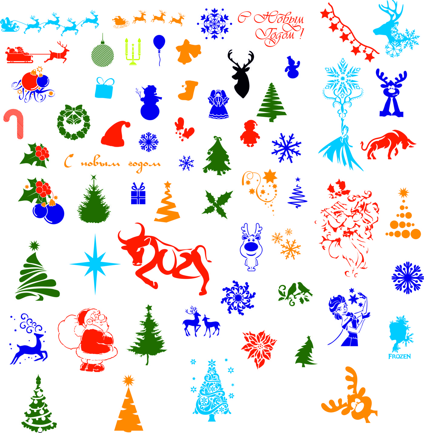 Состоит из рисунков малого, среднего и большого размеров (от 3 см до 18 см) новогодней тематики: